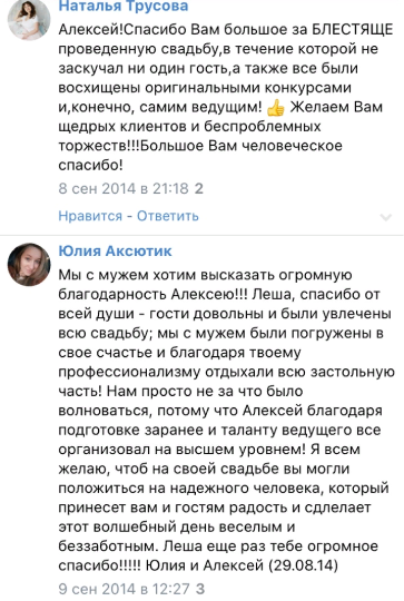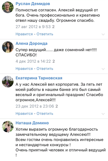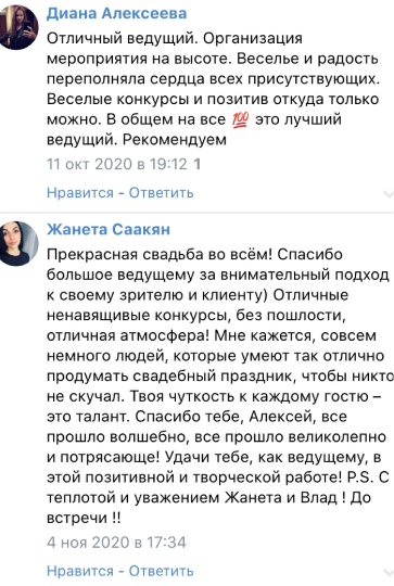 Провожу уникальные конкурсы и интерактивы. Имею отличное образование и воспитание, поэтому вам никогда не придется краснеть за шутки ведущего. У меня не бывает клишейных сценариев, то есть ваше мероприятие будет уникальным. Ценю каждого клиента, учитываю все пожелания и всегда выкладываюсь на полную